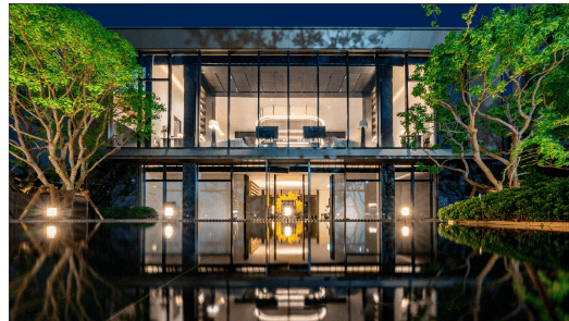 五进园林各具特色:一进府门,打造双重康莱德风酒店大堂,东侧大堂门头采用金属与温姆德灰高墙搭配,宽约50米的奢雅府门,搭配大片玻璃幕墙,让建筑与自然无界融合,呈现尊贵的归家体验;二进前园,打造安缦系水苑,跌水灵动、水境铺开,搭配“濯缨水阁”廊架、乌桕林,以及参照京都安缦打造的下沉式庭院,营造出雅逸脱俗、静谧诗意的氛围,夜幕降临后,氛围灯点缀其间,更添高贵内敛之感;三进水庭,规划约400㎡酒店式泳池CLUB,湛蓝池水搭配休闲廊架、躺椅,闲暇时与家人浅酌、畅游,享受清风微澜的惬意,解锁度假般的生活;四进林苑,开辟“森林乐园”,打造0-14岁儿童游乐天地与亲子研学基地,让不同年龄段的孩子都能在自然中自由探险、肆意玩耍,兼顾亲子互动与儿童成长;五进宅院,设置双重格调入户大堂,首层大堂搭配香槟金铝制艺术雨篷与巴西“蓝珍珠”石材,勾勒出雅奢大气的入户门面,彰显业主的尊崇身份。