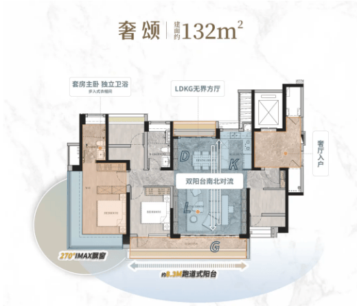 建面约132㎡户型:改善终极之选,四房两厅两卫设计,奢宅门厅搭配奢厅入户,无触直达宅门,彰显尊贵身份与归家仪式感。采用LDKG大方厅设计,空间开阔通透,遇见生活更多可能,无论是家人日常活动还是朋友聚会,都能轻松容纳;打造洄游厨房空间,中西两厨交融,满足不同烹饪需求,让烹饪成为一种乐趣;配备约8.3M跑道式景观阳台,揽境无限,视野开阔,可尽揽社区园林全景与城市风光,日常休闲、观景、晾晒均可满足;主卧配备270°巨幕观景窗,IMAX级景观环绕,空间宽敞舒适,配备独立卫生间与衣帽间,保障业主隐私与舒适度;景观与家政阳台双分离设计,空间各司其职,整洁有序,适合多人口家庭或追求高品质生活的改善型购房者。