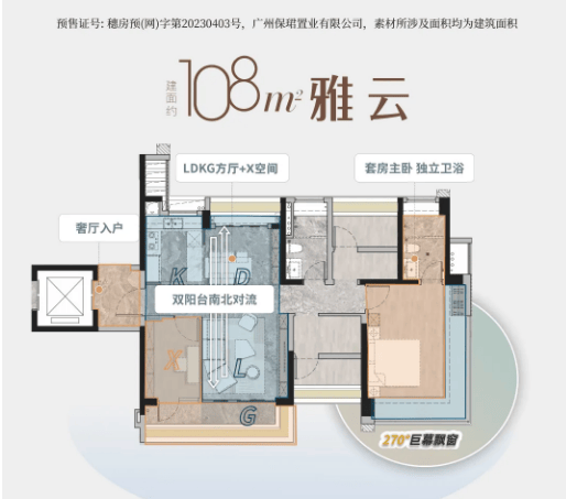 建面约108㎡户型:改善入门,四房设计,归家礼序分明,奢厅入户搭配脏净分离设计,勾勒出整洁有序的生活场景,避免入户脏乱影响室内环境。采用LDKG+X一体化设计,解锁家人互动新模式,客厅、餐厅、厨房、阳台相连,空间通透开阔,家人可在不同区域同时活动,增进彼此感情;配备双阳台设计,咫尺诗意享受,转身即是惬意生活,一个用于休闲观景,一个用于日常晾晒,兼顾美观与实用;主卧配备270°巨幕飘窗,拥揽盛世繁华与社区美景,空间宽敞舒适,适合四口之家居住。